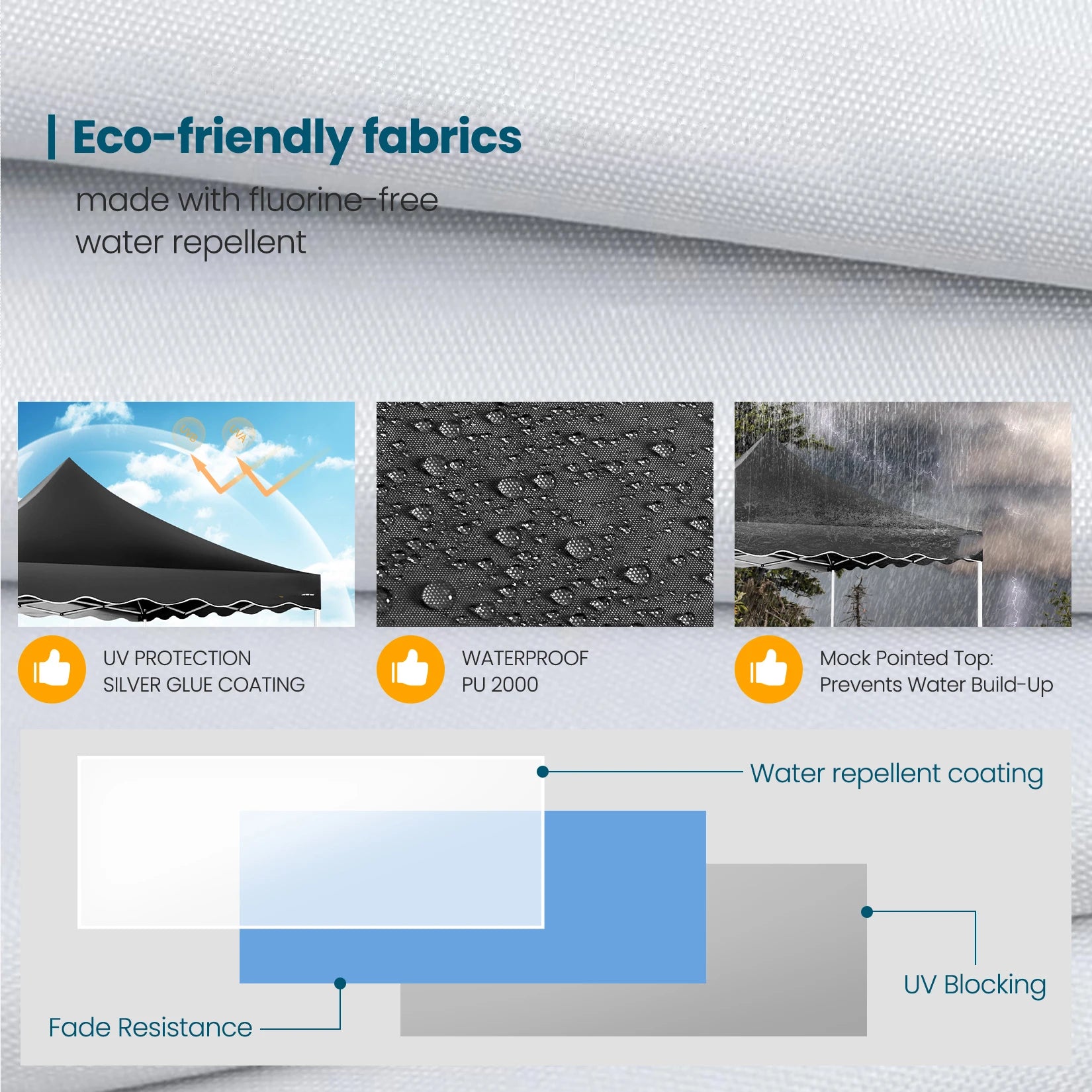 【Weather-Optimized Design】Engineered with elevated peak and extended eaves for efficient water management. UV50+ protection keeps interior cool and comfortable. Perfect for commercial vendors and outdoor social gatherings.