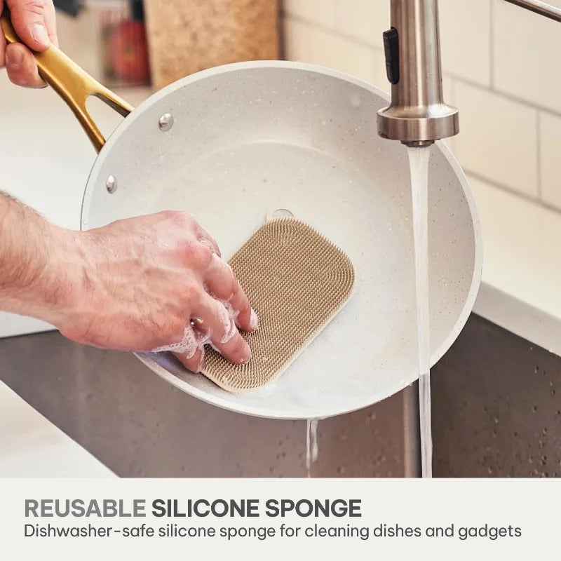 Kitchen Utensil Set Includes- Slotted Spatula, Mini Spatula, Solid Spoon, Mini Solid Spoon, Spatula, Mini Spatula, Whisk, Mini Whisk, Tongs, Silicone Spoon Rest, Silicone Sponge