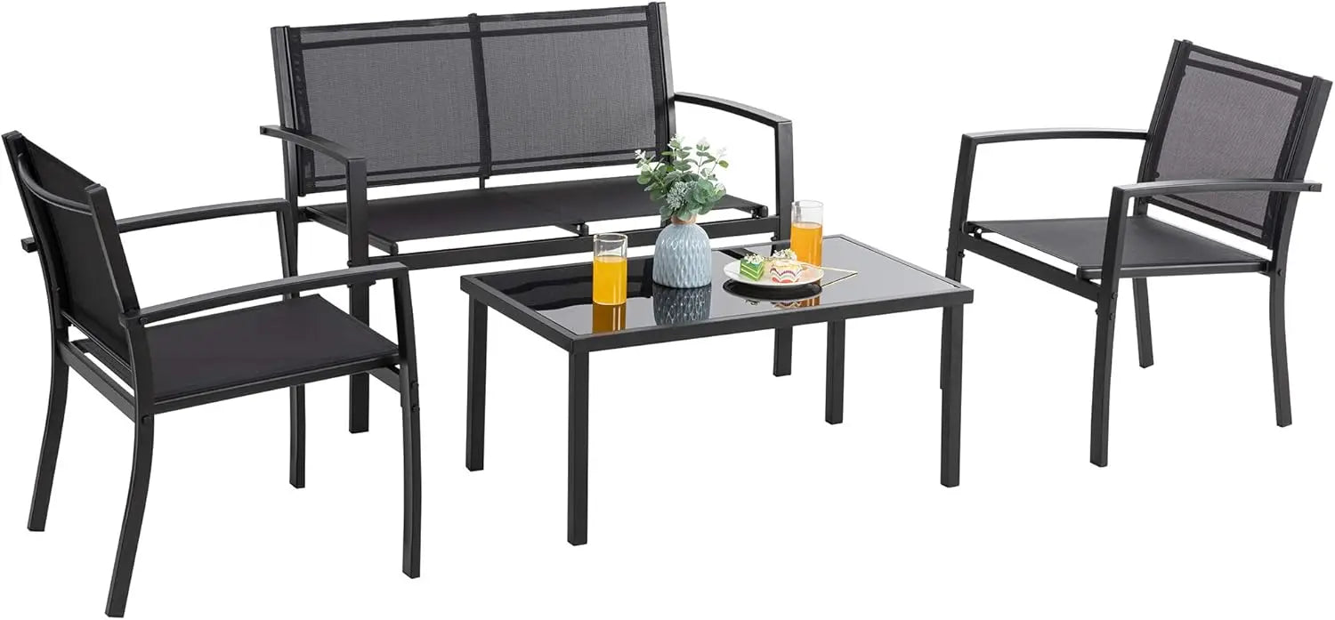 4 Pieces Patio Furniture Sets,Outdoor Patio Conversation Sets with Glass Coffee Table, Small Porch Balcony Furniture, Patio Table and Chairs Set for Garden, Backyard (Black)