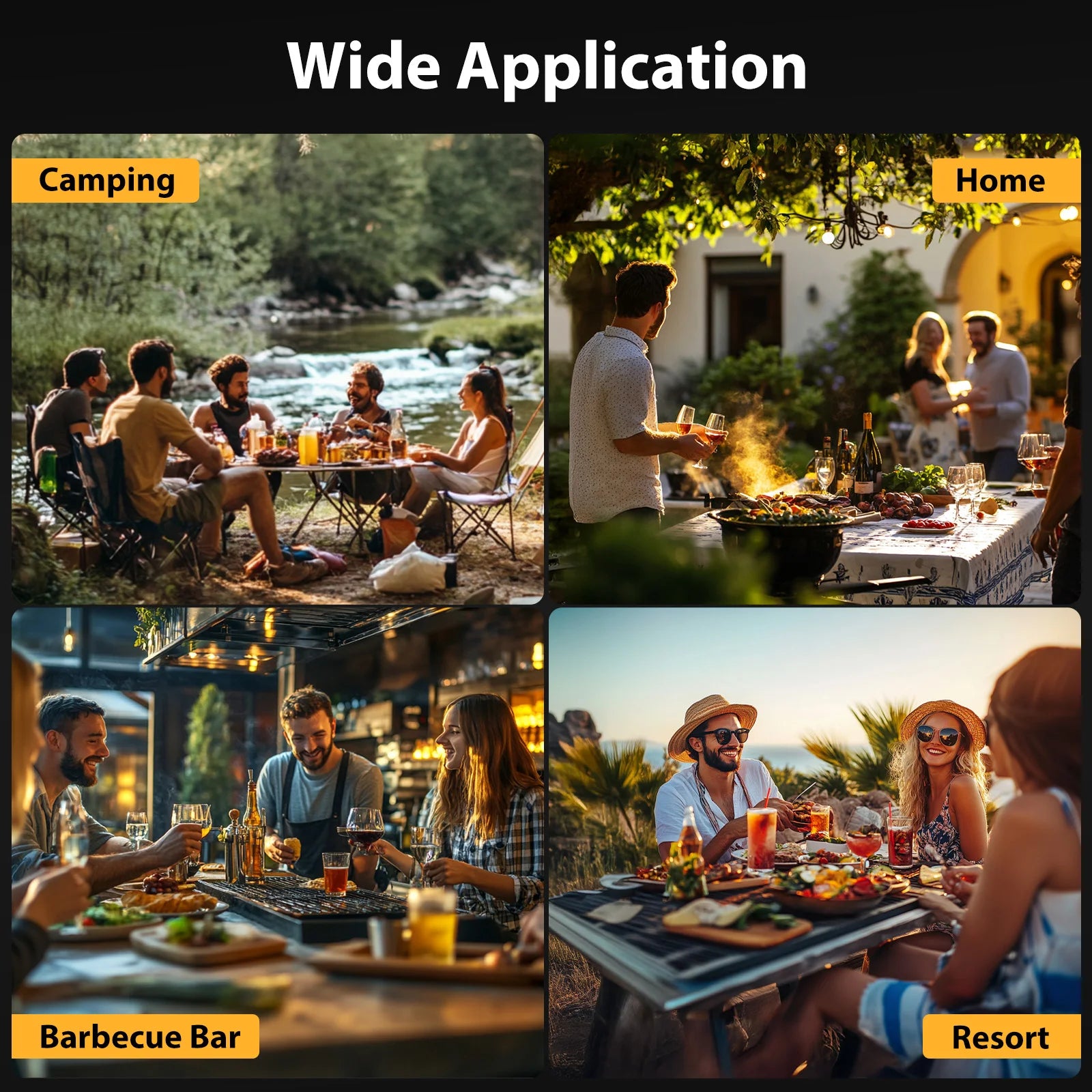 Equipped with 4 heavy-duty, lockable casters for smooth mobility on any terrain. Move it seamlessly between campsites, backyard parties, or outdoor kitchens.