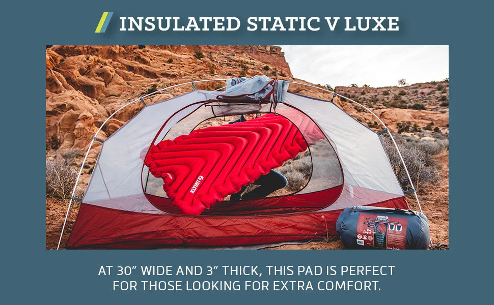 CAMPING SIMPLIFIED. The Insulated Static V Luxe is a lightweight, packable air pad mat that incorporates body-mapping chambers for ultimate comfort. The result: side, back, and stomach sleepers can all rest comfortably on a generous bed of air.