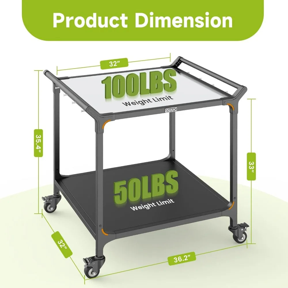 This grill cart boasts a large stainless steel tabletop, measuring 32 inches by 32 inches, providing an expansive 1024 square inches of workspace, ideal for both indoor and outdoor cooking. It features double-level shelves for ample storage, with hooks on both sides for hanging grilling tools like brushes and spatulas, and a side handle bar for hanging towels. The cart is built with a heavy-duty steel tube frame, ensuring durability and the ability to support up to 100 pounds on the tabletop and 50 pounds on the second shelf, making it suitable for most BBQ griddle grills or pizza ovens. Mobility is enhanced with four 2-inch heavy-duty silent caster wheels and side handles, allowing for easy movement between locations. Versatile in its use, this outdoor grill table can serve as a kitchen island indoors or as a BBQ grilling table, grill cart, griddle stand, pizza oven stand, food prep station, or potting bench outdoors.