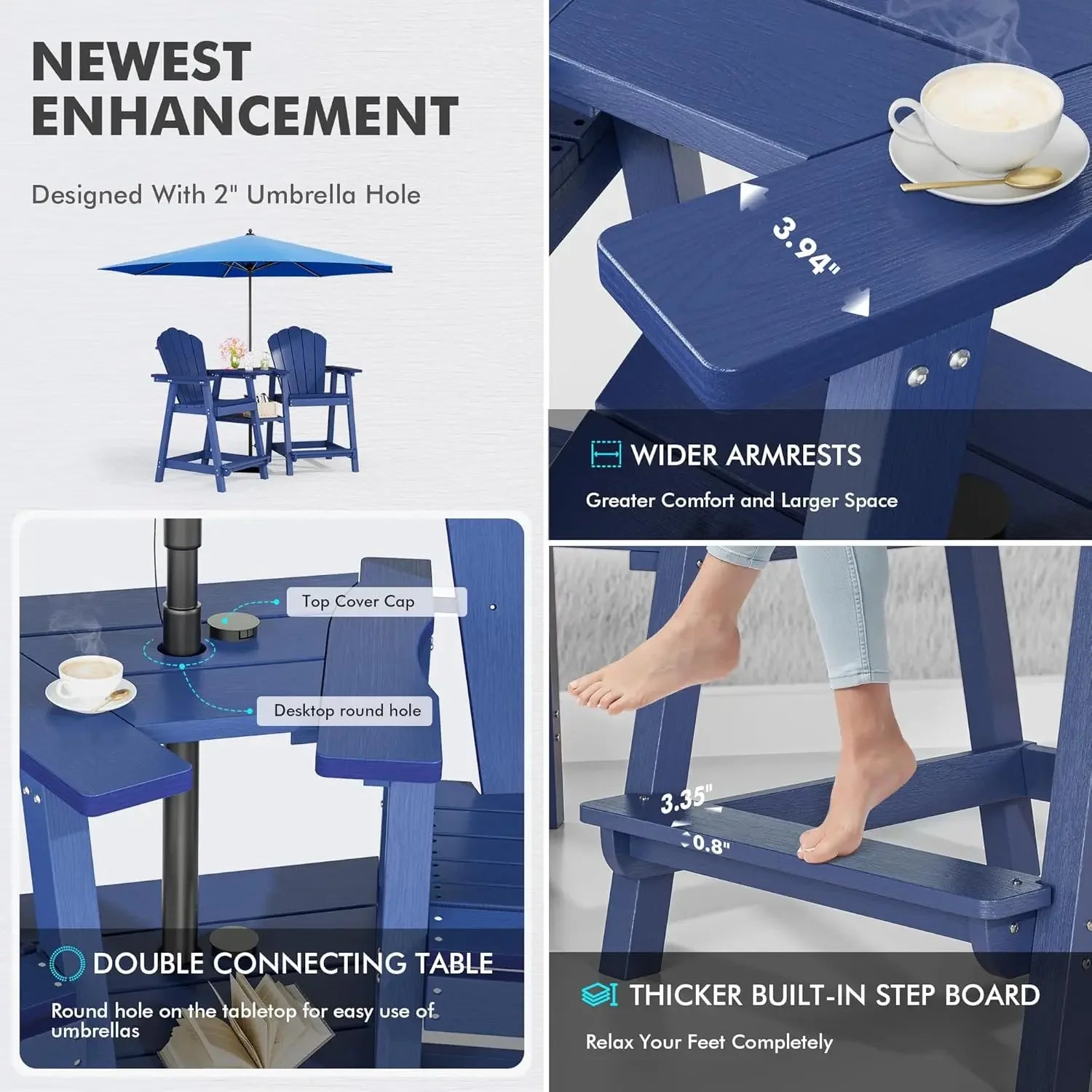 - Ergonomic Design: The ergonomic backrest and widened armrests of tall adirondack chairs set of 2 with table provide exceptional support for your back and arms. The footrest allows your legs to rest naturally, ensuring maximum comfort and relaxation