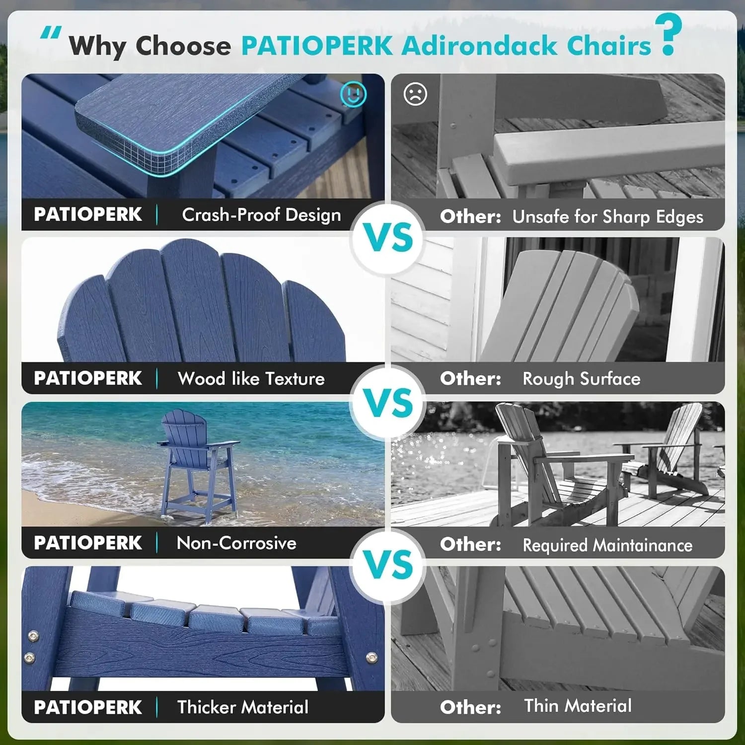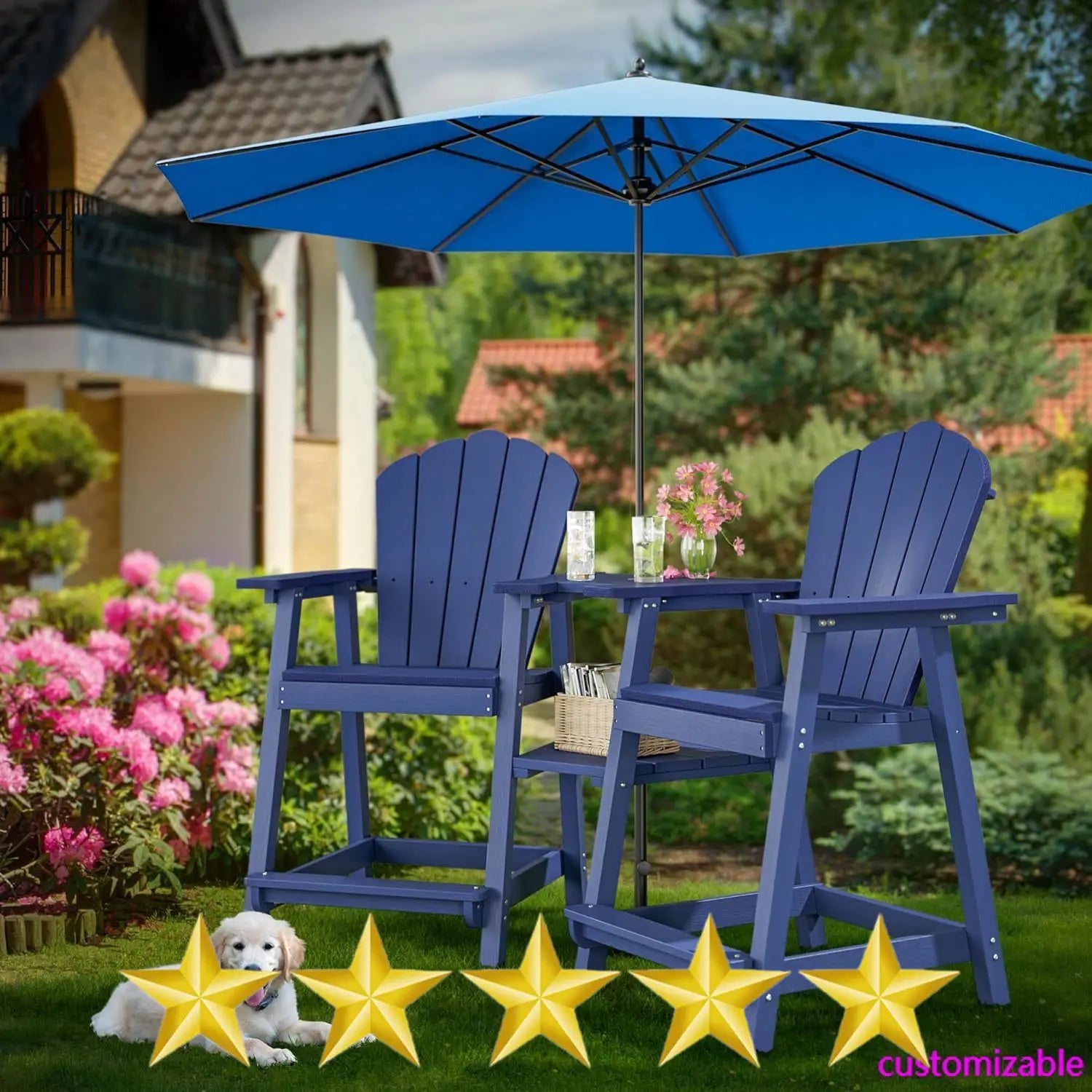 - Double-Layer Tray with Umbrella Hole: PatioPerk Tall Adirondack Chairs features a double-layer tray with a 2-inch umbrella hole. The upper tray holds drinks or small items, while the lower tray offers extra storage. Perfect for shaded outdoor relaxation