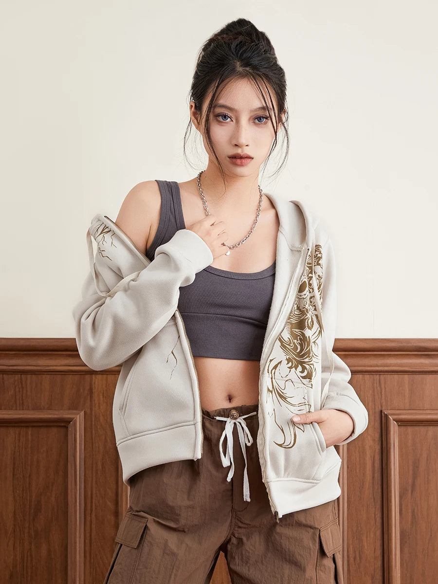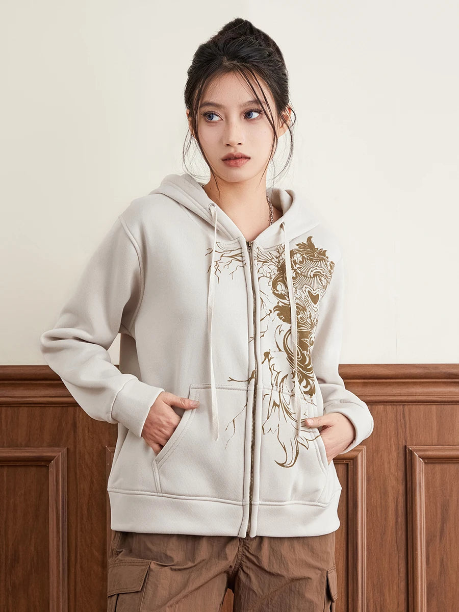 Women Hoodie, Vintage Long Sleeve Graphic Print Zipper Closure Sweatshirt with Pockets